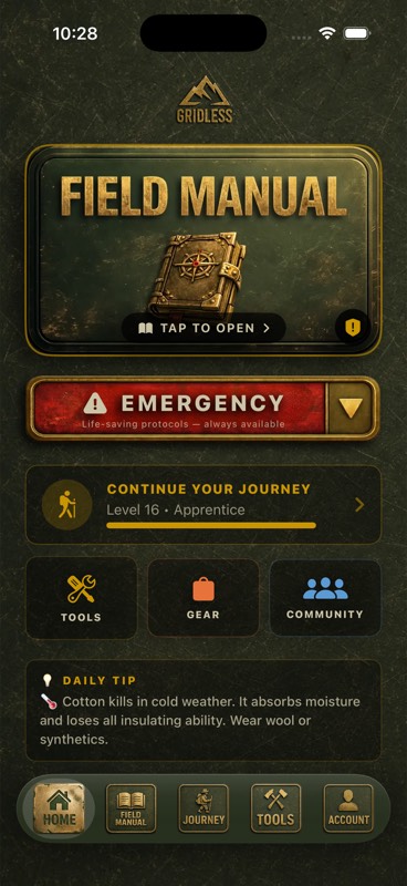 Your phone is useless without signal — unless you have Gridless. 605 survival guides, emergency protocols, and real skills. All available offline.
